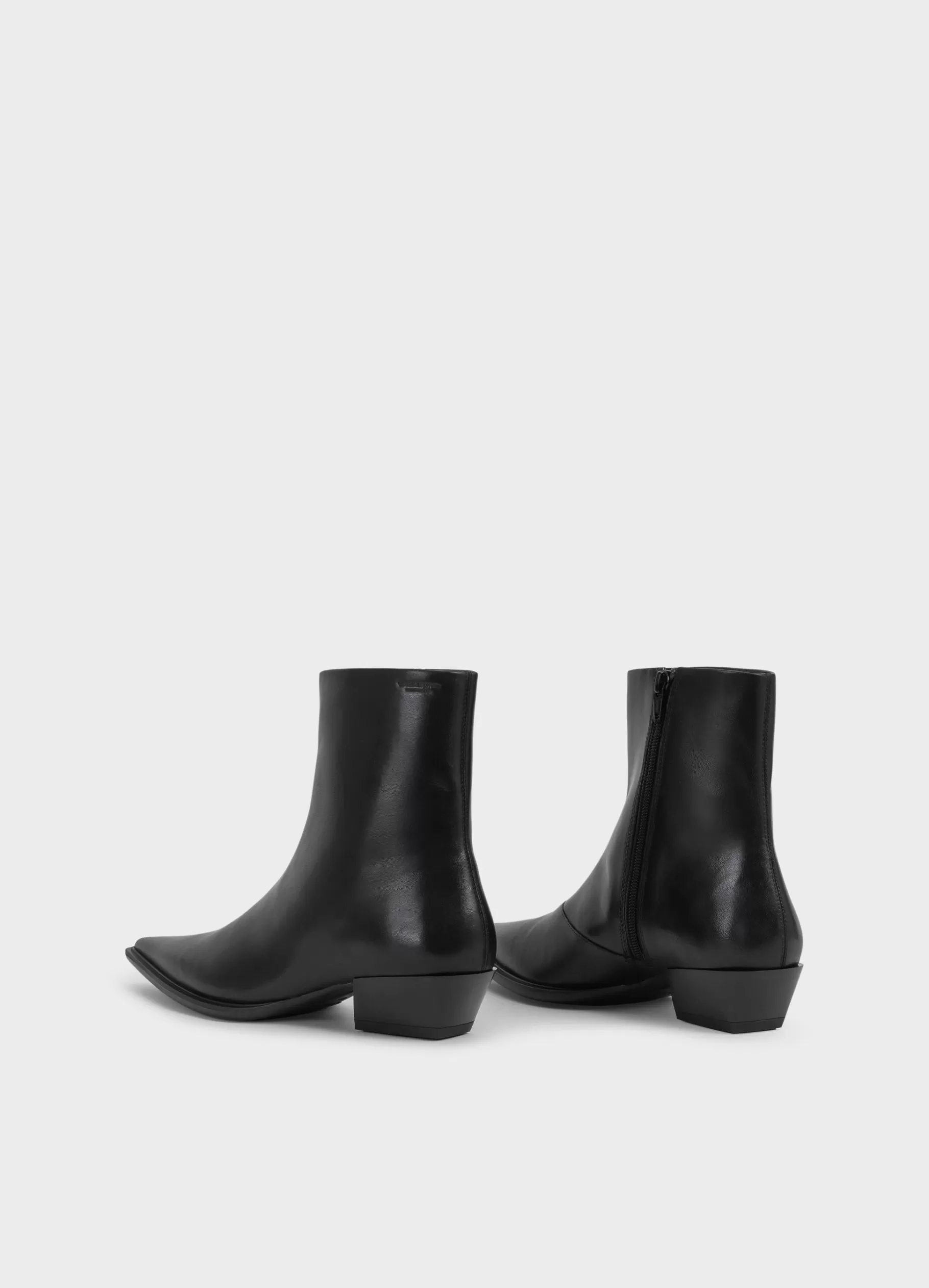 Cassie is een minimalistische western laars voor dagelijks gebruik. De stijl is gemaakt van zwart leer en heeft een puntige neus en een ritssluiting aan de zijkant. Met een schuine blokhak van 40mm.