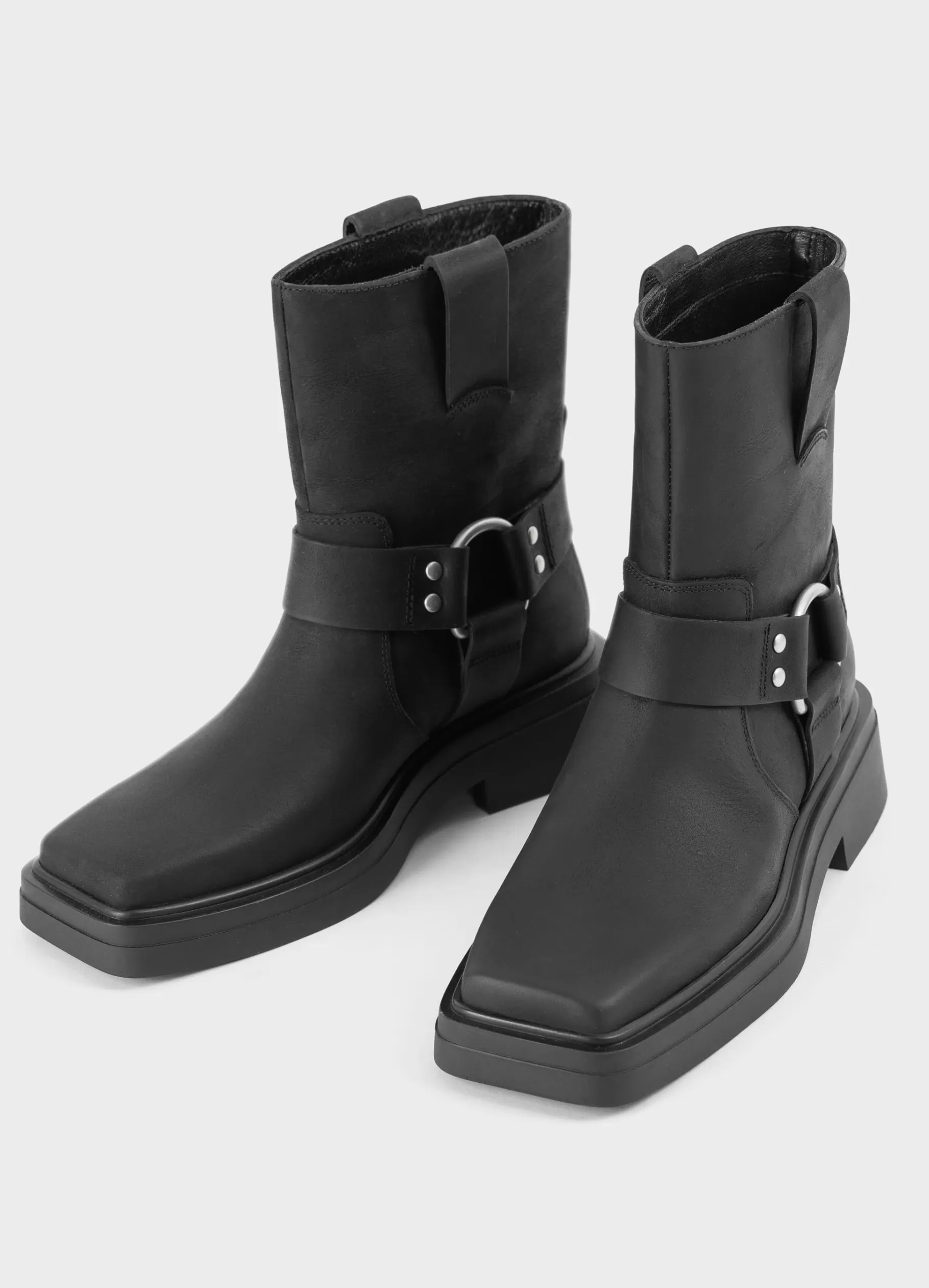 Eyra is een harness enkellaarsje met een eigentijdse look. De stijl is gemaakt van gebroken-zwart gevet nubuck en heeft een ruime neus, decoratieve harness details, en een pull-on design. Met een stevige hak van 45mm. Afgewerkt met dubbele treklusjes aan de schacht.